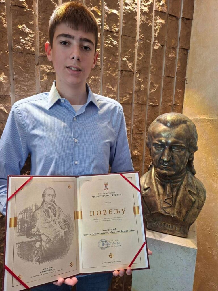 Наш ђак, Јанко Јеленић 8/5, добитник је и Доситејеве повеље за изузетне резултате постигнуте у претходној години. Повеља се додељује појединцима и установама образовања и васпитања као признање за досадашње резултате и подстрек за даље успехе. Ово је права реткост и преседан да један ученик добије два овако висока признања те честитамо Јанку, његовим родитељима и наставницима јер је ово велики успех за нашу школу!